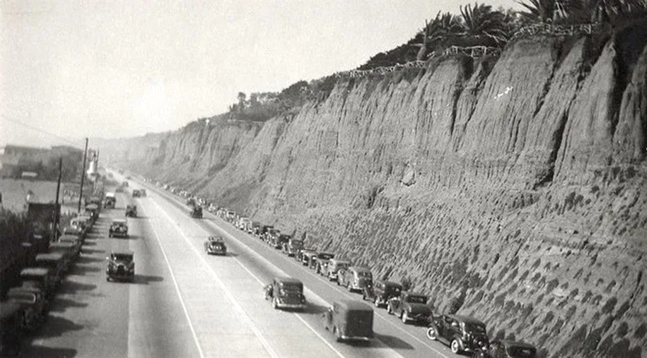 (ca. 1948)* – Looking down from above PCH toward the Deauville Club with cars turning into the McClure Tunnel. Photo courtesy of Eric Wienberg Collection via Pepperdine University Special Collections. |