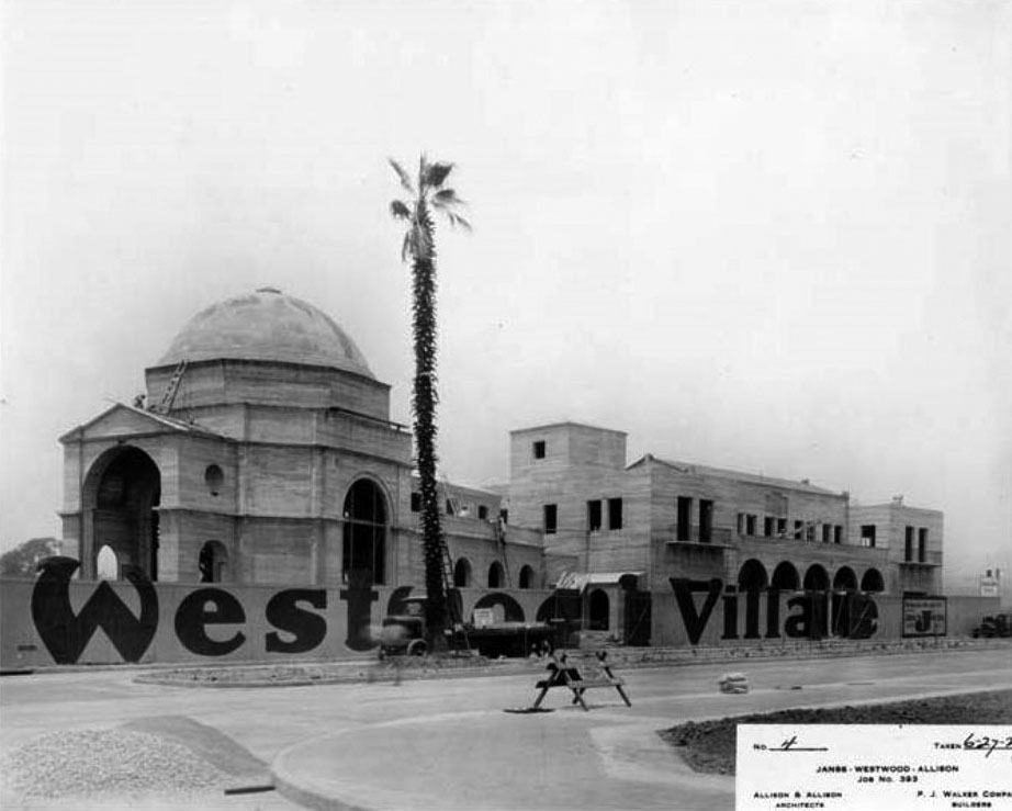 | (1929)#^ - View showing Westwood Village under construction. The Janss Dome seen above was the first building to be constructed. When completed in 1930 it would house the headquarters of the Janss Investment Company |