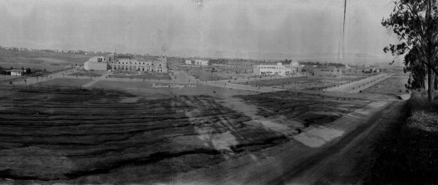| (1929)^.^ – Aerial view showing the newly built Westwood Village with the original UCLA buildings seen in the background. |