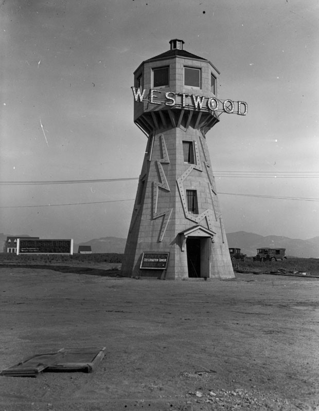 Historical Notes Built by the Janss Investment Corporation in the 1920s, this oddly shaped tower was located on the northeast corner of Wilshire and Beverly Glen Boulevards. It stood at 420 feet above sea level, making it the highest point on Wilshire Boulevard at the time and was used primarily as a landmark advertisement. At night, the lightning bolts along the sides and the 'WESTWOOD' sign would light up and be seen for miles. Potential home owners were allowed to climb the tower to get a better view of the new community and identify the lot they would like to purchase.^# |