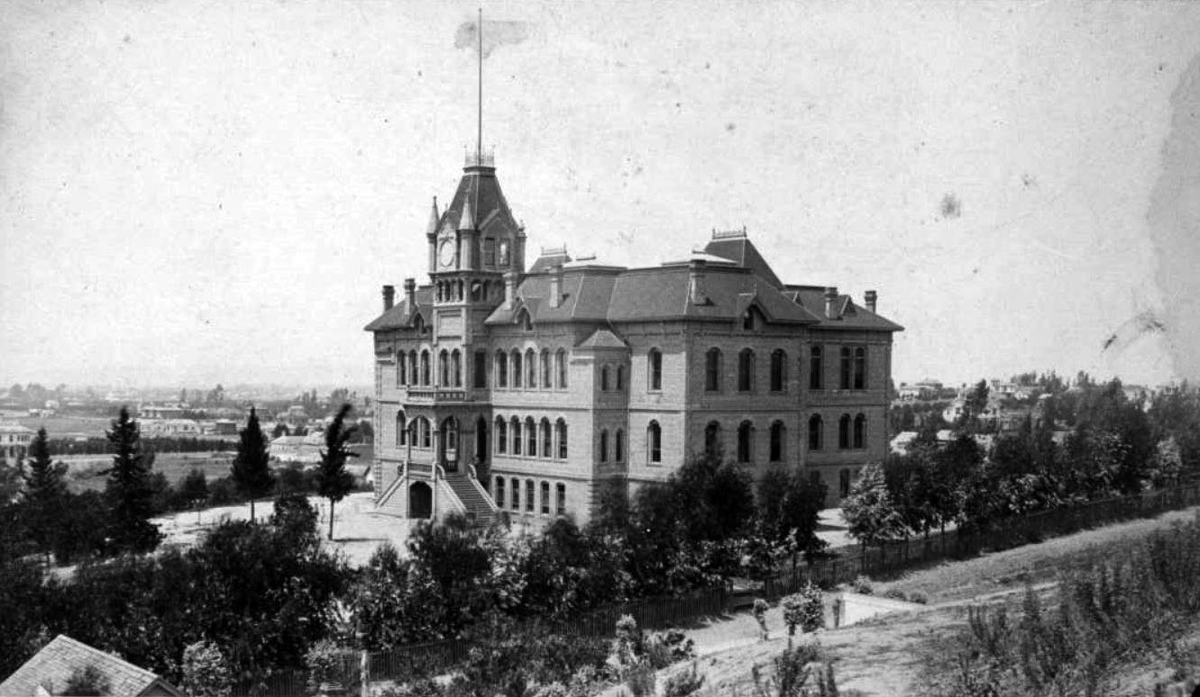 | (ca. 1893)* - Southwest corner view of the State Normal School, located at Grand and 5th Street. A long and winding driveway is located on the left side of the entrance, and a long flight of stairs (barely visible) is on the right; the school sits impressively on the last knoll of Bunker Hill, aptly dubbed "Normal Hill". |