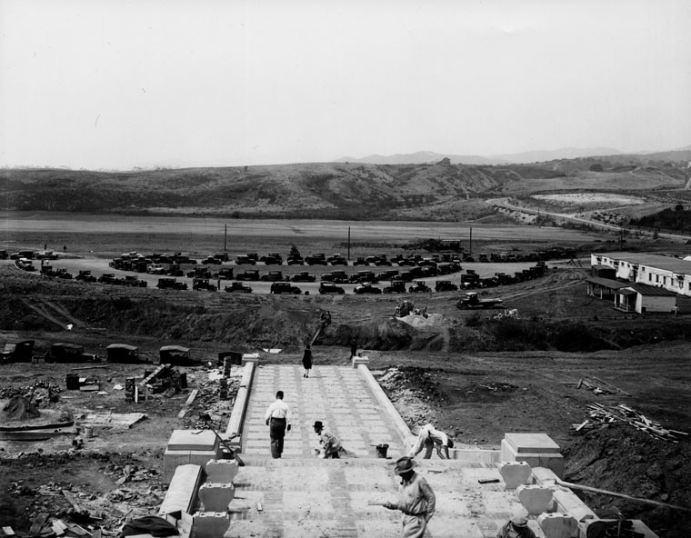 | (ca. 1928)* - View of the new UCLA Westwood campus looking west from the top of Janss Steps. Workers are seen constructing the steps. |