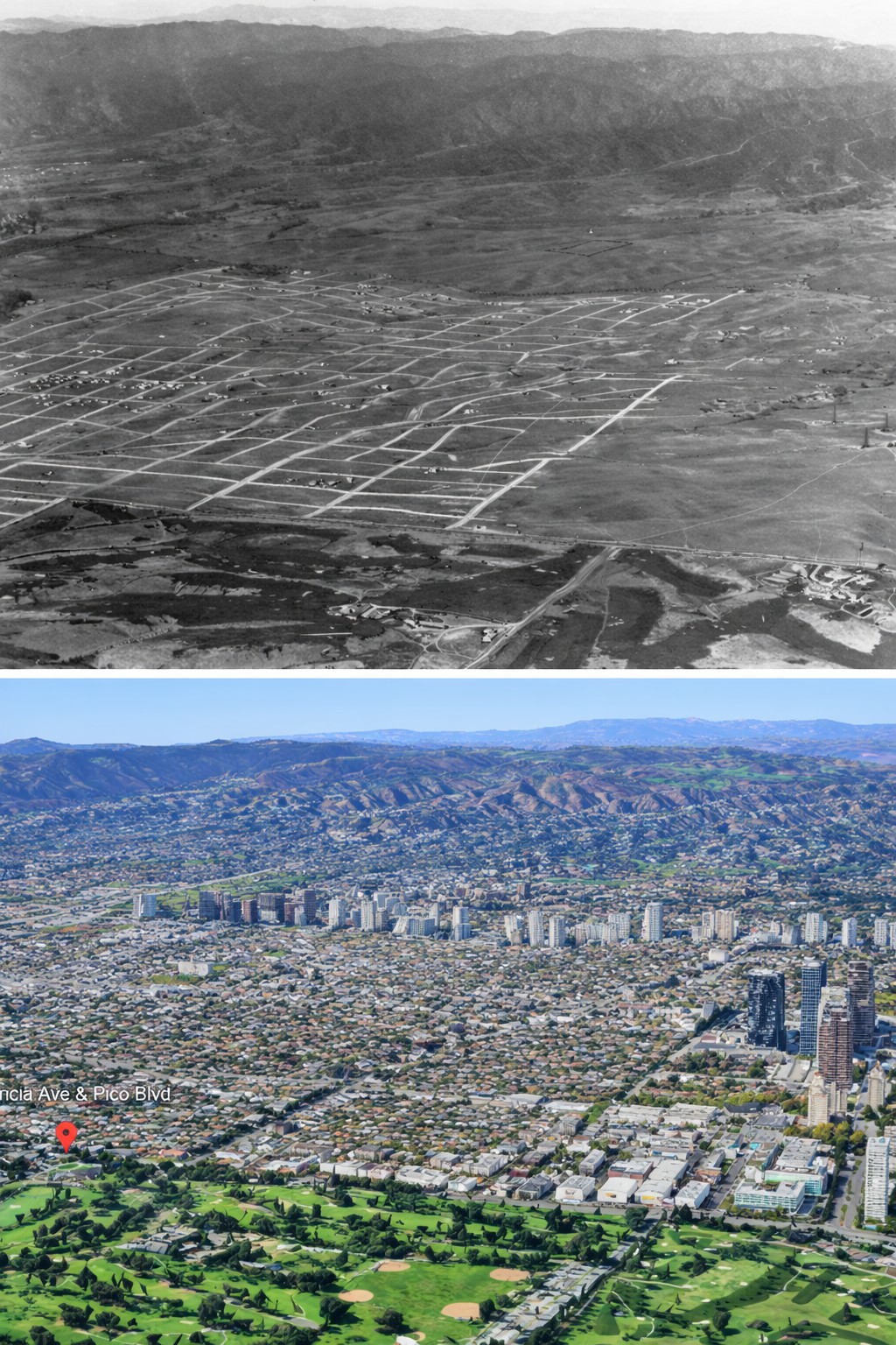 | (1924 vs 2024)* - Then and now views of the Westside, looking across land that was being subdivided from the former Wolfskill Ranch in 1924. The area shown spans what later became Westwood to the north of Santa Monica Boulevard, with adjacent neighborhoods including Rancho Park and Century City visible in the modern view. Wolfskill Ranch parcel, once isolated at the T-junction of Overland Avenue and the Pacific Electric right-of-way (later Santa Monica Boulevard), is today the site of the Los Angeles LDS Temple. Photo comparison by Jack Feldman. |