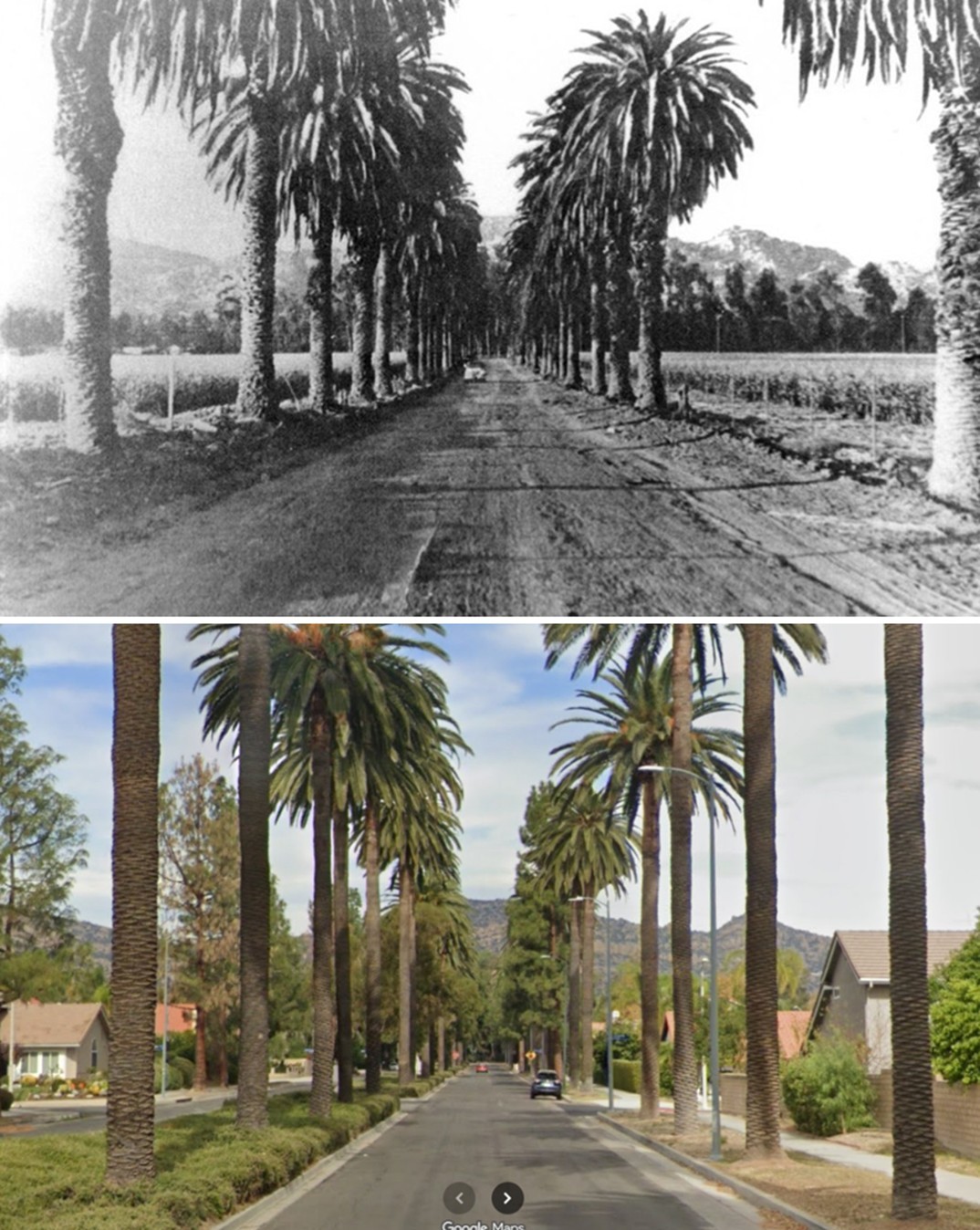 | (1927 vs 2022)*- Then and Now view looking southeast along Ventura Blvd at Van Nuys Blvd in Sherman Oaks, showing its transformation from a rural crossroads in 1927 to a major urban corridor today. Photo comparison by Jack Feldman. |
