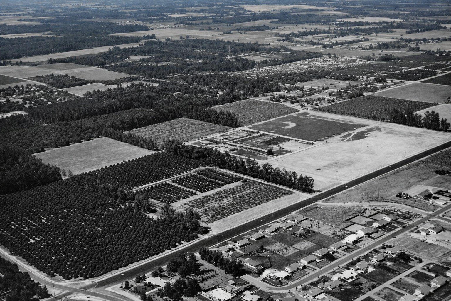 | (1956)* - Aerial view looking northwest of the new San Fernando Valley Branch of Los Angeles State College, later California State University, Northridge. The intersection of Zelzah Avenue and Nordhoff Street appears in the left foreground. |