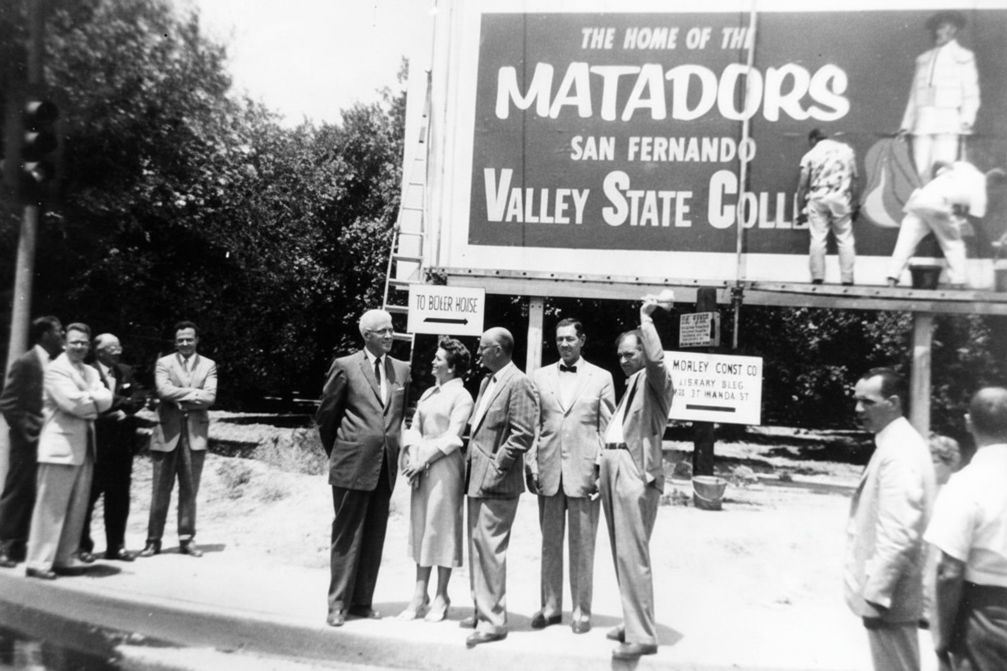 | (1958)^ - The new San Fernando Valley State College sign installed in 1958 following the institution's separation from Los Angeles State College. Pictured from left: Howard McDonald, President of Los Angeles State College; Ralph Prator, first President of San Fernando Valley State College; and Delmar T. Oviatt, Dean of Instruction. |