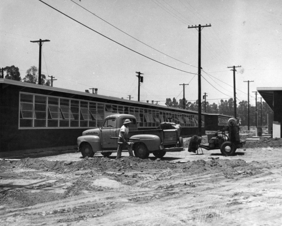 | (1956)* – Valley Times photograph showing temporary buildings at the new San Fernando Valley State College campus in Northridge, published July 26, 1956. These structures housed the first students when the college opened in September of that year. Initial instruction concentrated on business and teacher training, with plans already in place for expansion into a full four-year liberal arts program. |