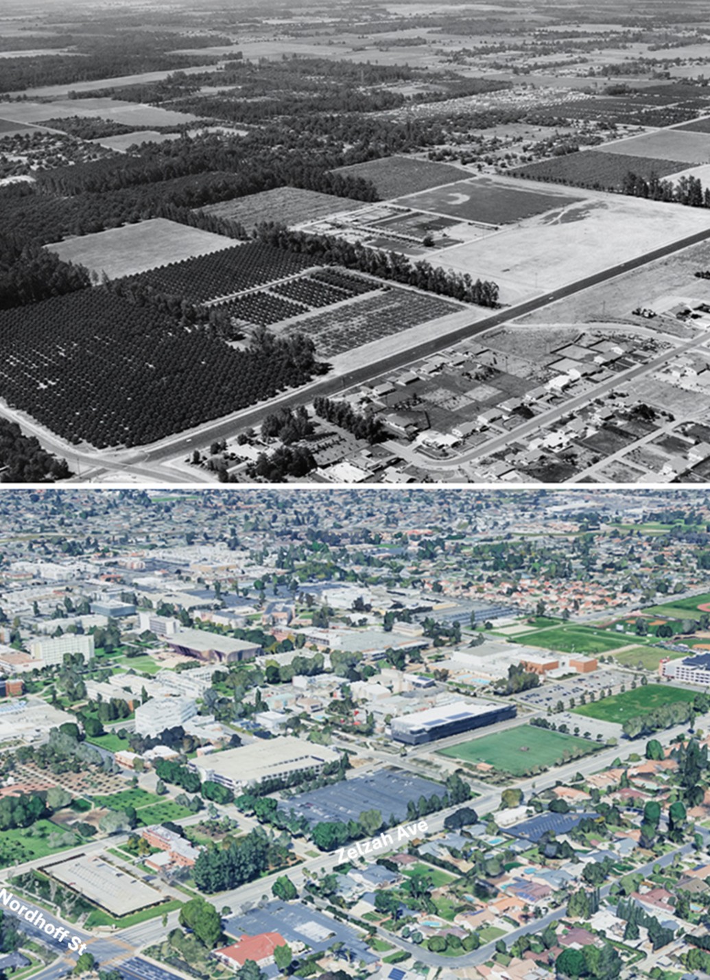 | (1956 vs. Today)* — Then and Now aerial view looking northwest over the future site of California State University, Northridge. The intersection of Zelzah Avenue and Nordhoff Street appears in the lower left of both images. What was once orchards and open farmland is today one of the largest university campuses in the California State University system. Photo comparison by Jack Feldman. |
