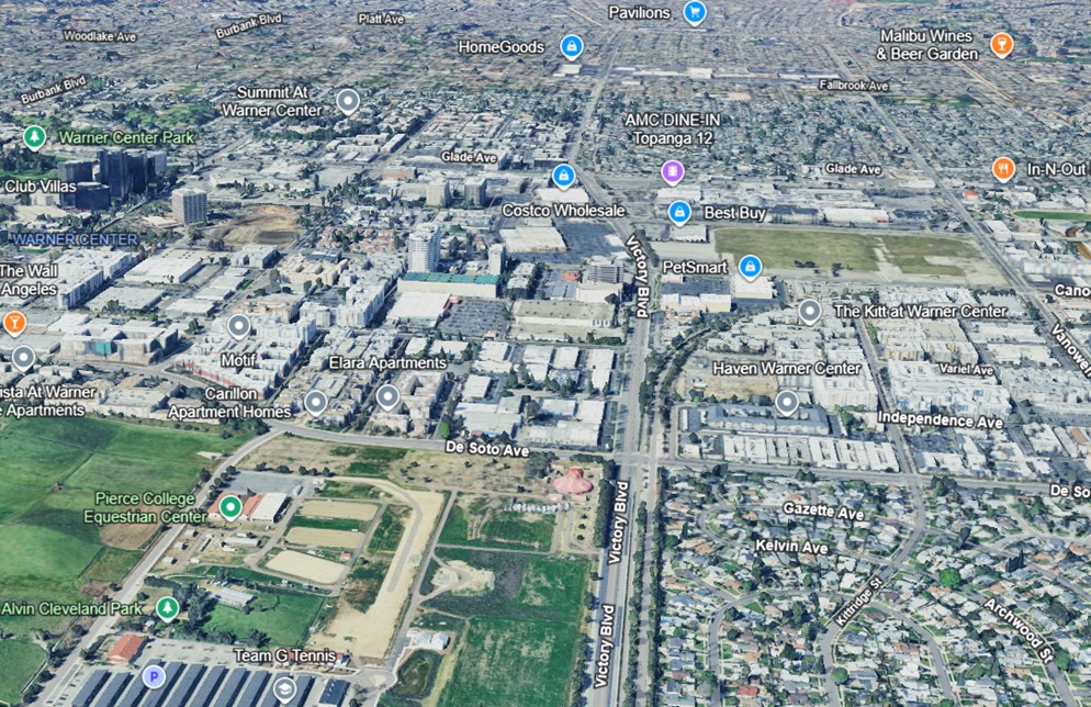 | (2023)* - Contemporary view of the northwest corner of Ventura and Reseda Boulevards, showing a Coffee Bean & Tea Leaf and Wicked Cow Burgers. |