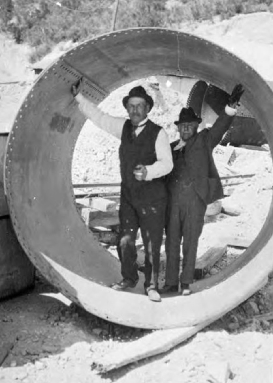 | (ca. 1916)* - Mulholland and Commissioner Del Valle in 80-Inch Pipe |