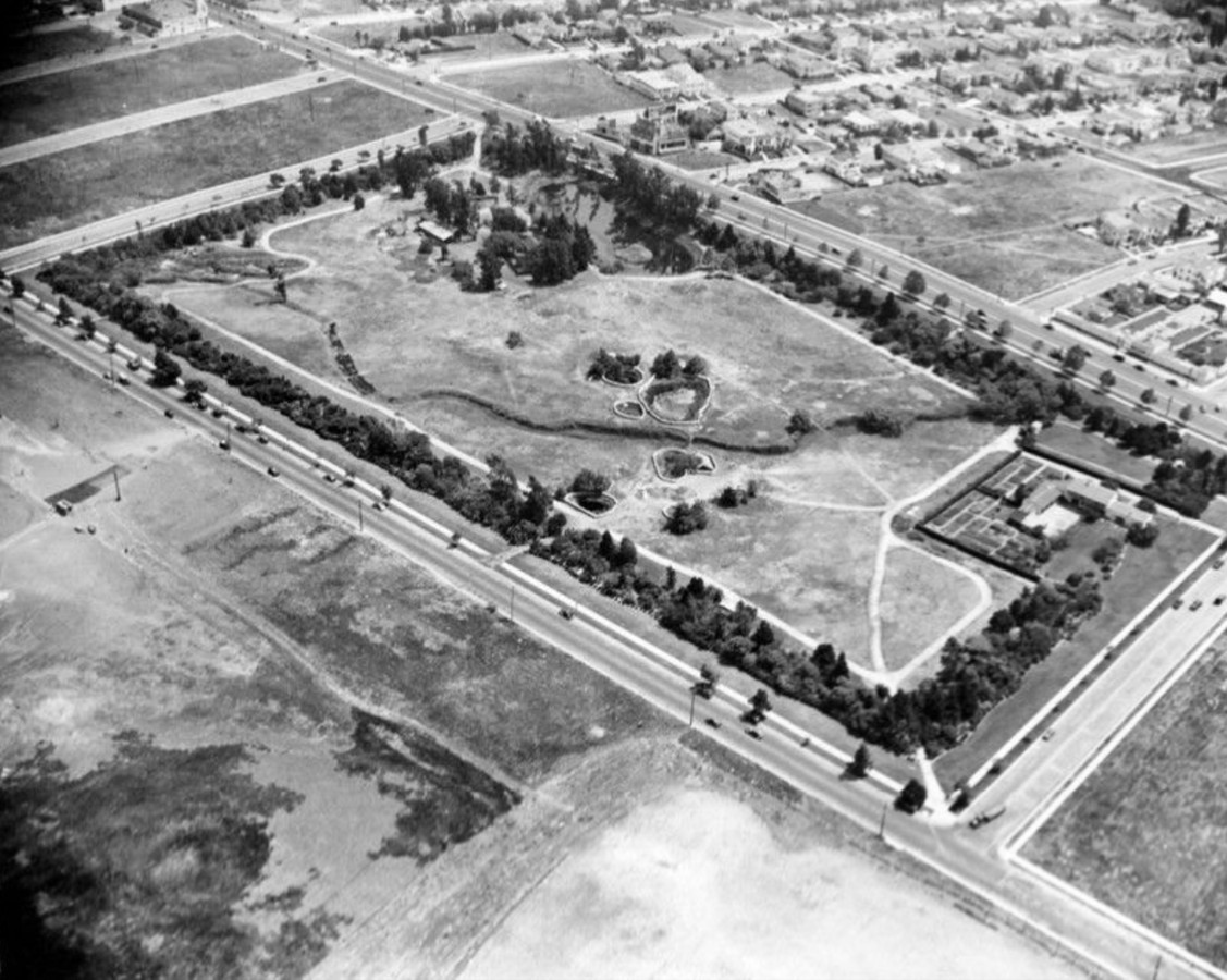 | (1924)* – Aerial view looking southeast showing the La Brea Tar Pits and new housing development. Wilshire Boulevard runs diagonally at upper right. Curson Avenue appears at upper left and Sixth Street runs diagonally at bottom. |