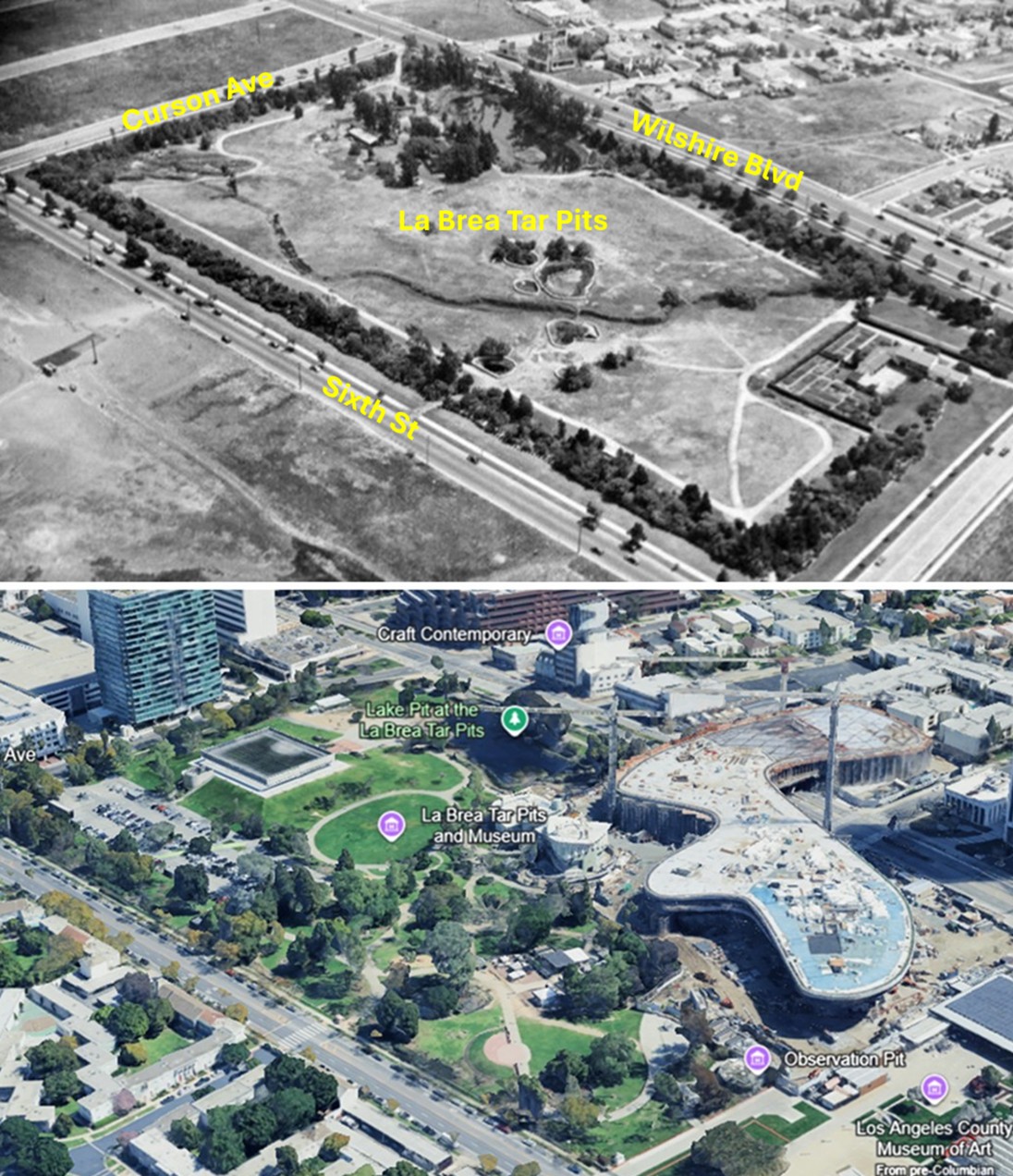 | (2023)* – Aerial view of the La Brea Tar Pits and the Los Angeles County Museum of Art campus during construction. Wilshire Boulevard runs along the upper edge, Sixth Street at lower left, and Curson Avenue at upper left. Image date: 12/1/2023. |