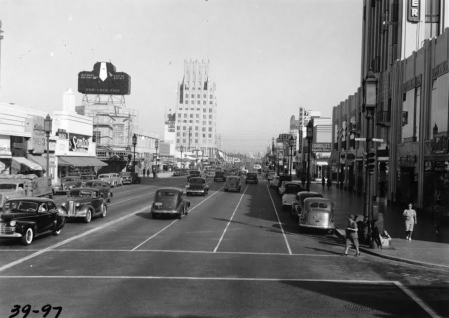 | (ca. 1940)^ - View looking west on Wilshire Boulevard. The Coulter Building is seen on the southwest corner of Hauser and Wilshire. Citizens National Trust & Savings Bank may also be seen on the right. |