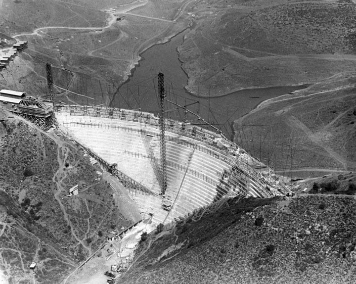 | (1924)* - Aerial view shows the construction of the Mulholland Dam and the Hollywood Reservoir beginning to take form. |