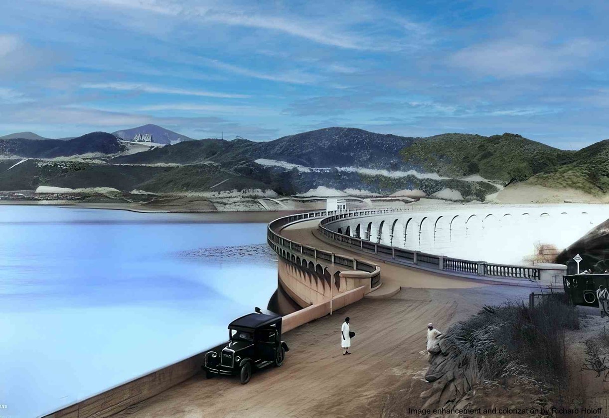 | (1928)* - Mulholland Dam and Hollywood Reservoir, same view as above. AI enhancement and colorization by Richard Holoff. |