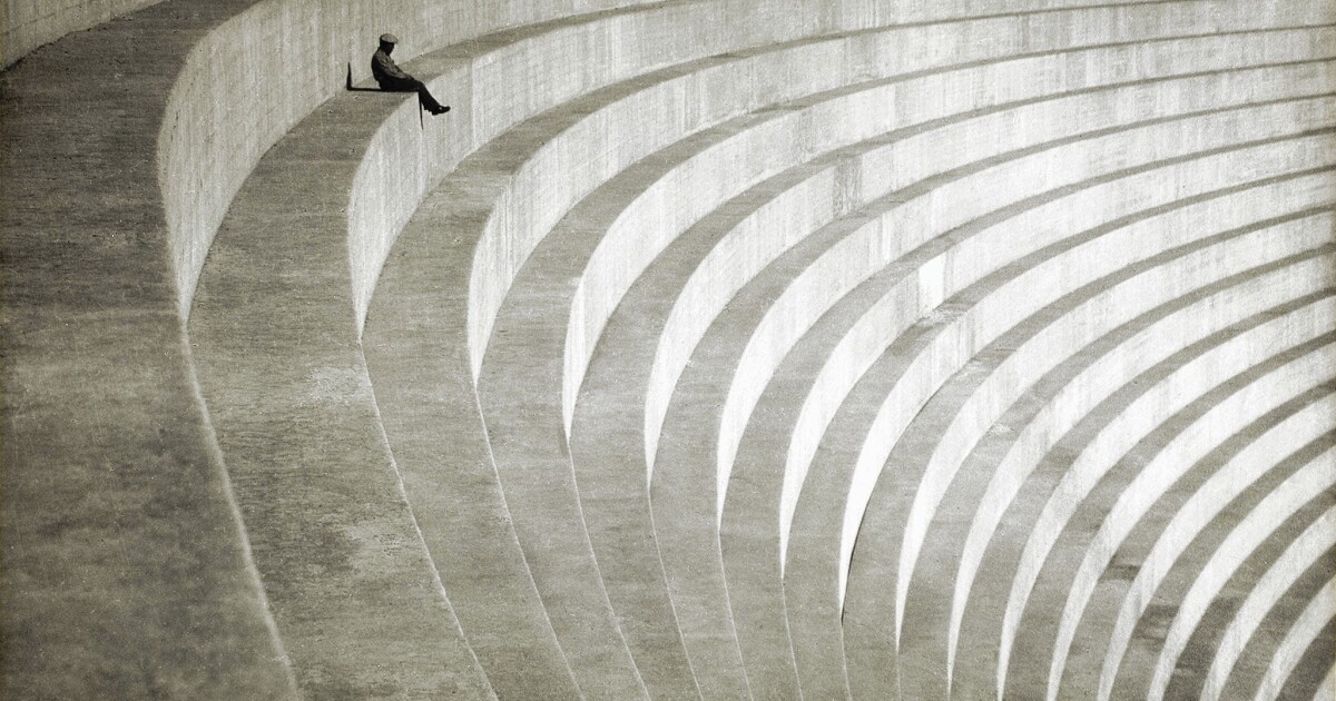 | (ca. 1930)* – Photo by Hiromu Kira titled “The Thinker,” showing a man seated on the elegantly curved wall of the Mulholland Dam. |